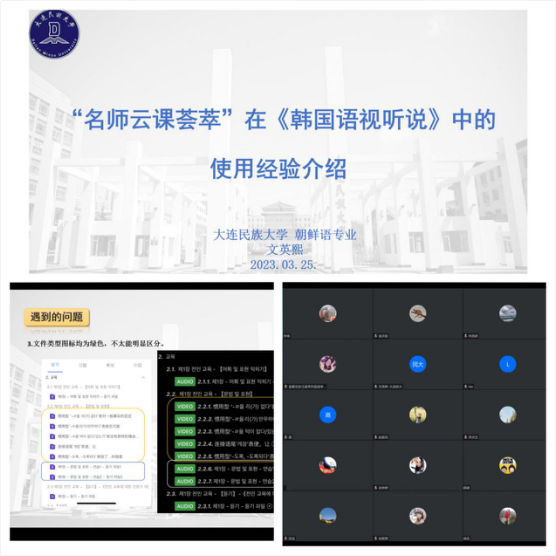 大连民族大学的文英熙老师以线上方式参会,分享了名师云课荟萃”在本科三年级课程《韩国语视听说》中的使用经验。文英熙在课程设计中,充分运用了平台中现有的语法知识点资源,并通过自主添加符合实际教学需要的图片、音视频及PDF资料,打造了一门以培养学生的语言应用能力为主要目标,以学生为本,注重小组合作学习,提高学生自主学习能力的课程。文老师的课程设计思路和平台使用技巧带给了与会教师极大的启示,也提出了许多具体而实际的意见和建议。