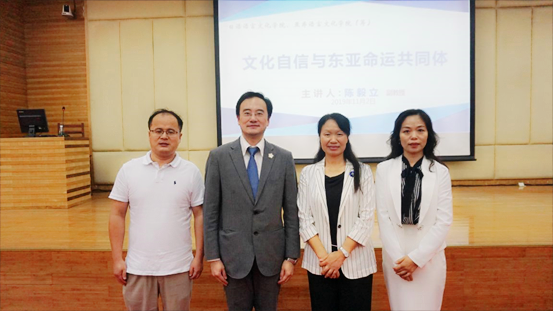 本网讯 11月2日上午,同济大学外国语学院陈毅立副教授莅临BETVLCTOR伟德在线作“文化自信与东亚命运共同体”主题讲座。讲座在图书馆负一层报告厅举办。学院党委书记周秀娇、副院长杨晓辉、副院长胡瑞、辅导员朱浩文以及BETVLCTOR伟德在线18级学子参加并聆听了本次讲座。讲座由副院长杨晓辉教授主持。