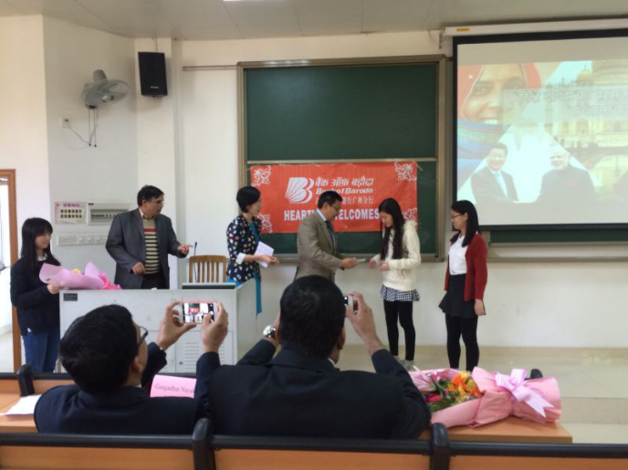 颁奖仪式后,是广外印地语专业的首本刊物“Sanchetna”的发布仪式,两位学生主编对杂志内容进行简要介绍,并给总领事一行现场赠送了刊物。