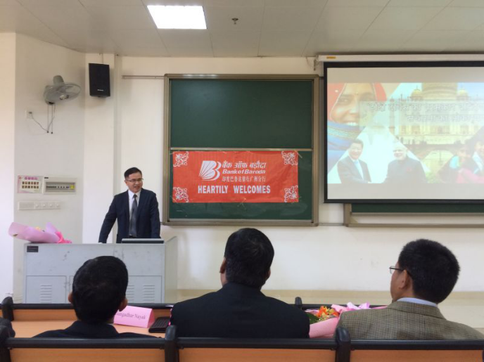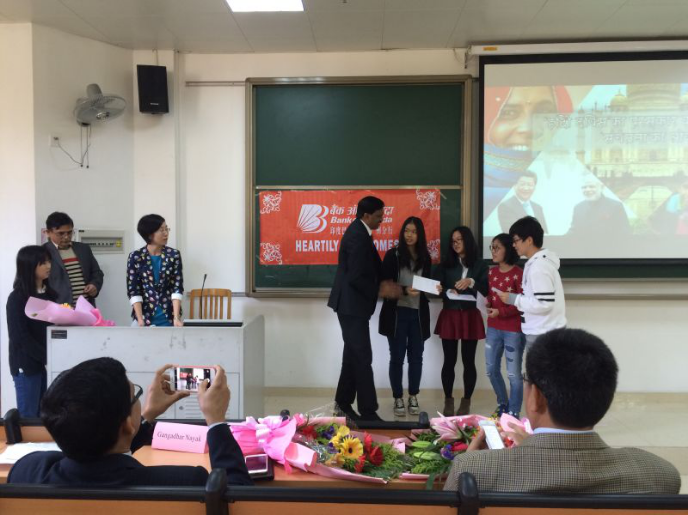 院长陈多友教授首先对总领事的来访表示热烈欢迎,并对印度驻广州总领事馆对我校印地语专业的大力支持表示感谢。在颁奖环节活动中,总领事一行为竞赛中获得优异成绩的同学颁奖。获得一等奖的两位同学现场进行了印地语演讲和诗歌朗诵。