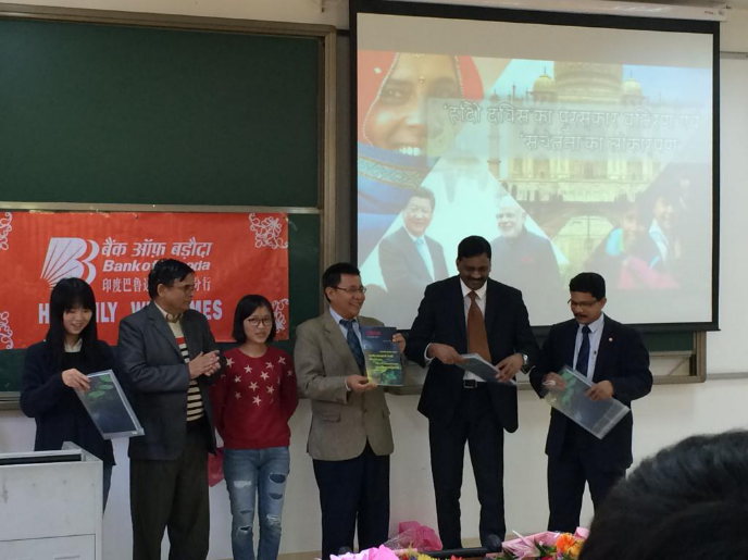 11月2日,印度驻穗总领事馆总领事Y. K. Sailas Thangal先生首访我校印地语专业,并出席了“2015世界印地语日演讲比赛”的颁奖活动和印地语专业首本内部刊物发布仪式。总领馆文化参赞P.V. Manoj Kumar先生和印度巴鲁达银行广州分行负责人Gangadhar Nayak陪同来访。东方语言文化学院院长陈多友教授、印地语专业特聘教授王金峰老师、南亚语言文学系主任胡瑞老师会见了来宾。一同参加颁奖活动及发布仪式的还有印地语专业全体师生。
