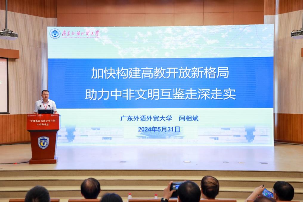 在高校代表发言环节,闫相斌作题为“加快构建高教开放新格局, 助力中非文明互鉴走深走实”的报告,从人才培养模式、教研科研成果、产学研一体化机制和国际中文教育四个方面总结了我校对非合作的主要模式和成果,展望了我校与非洲国家在教育领域的合作前景。