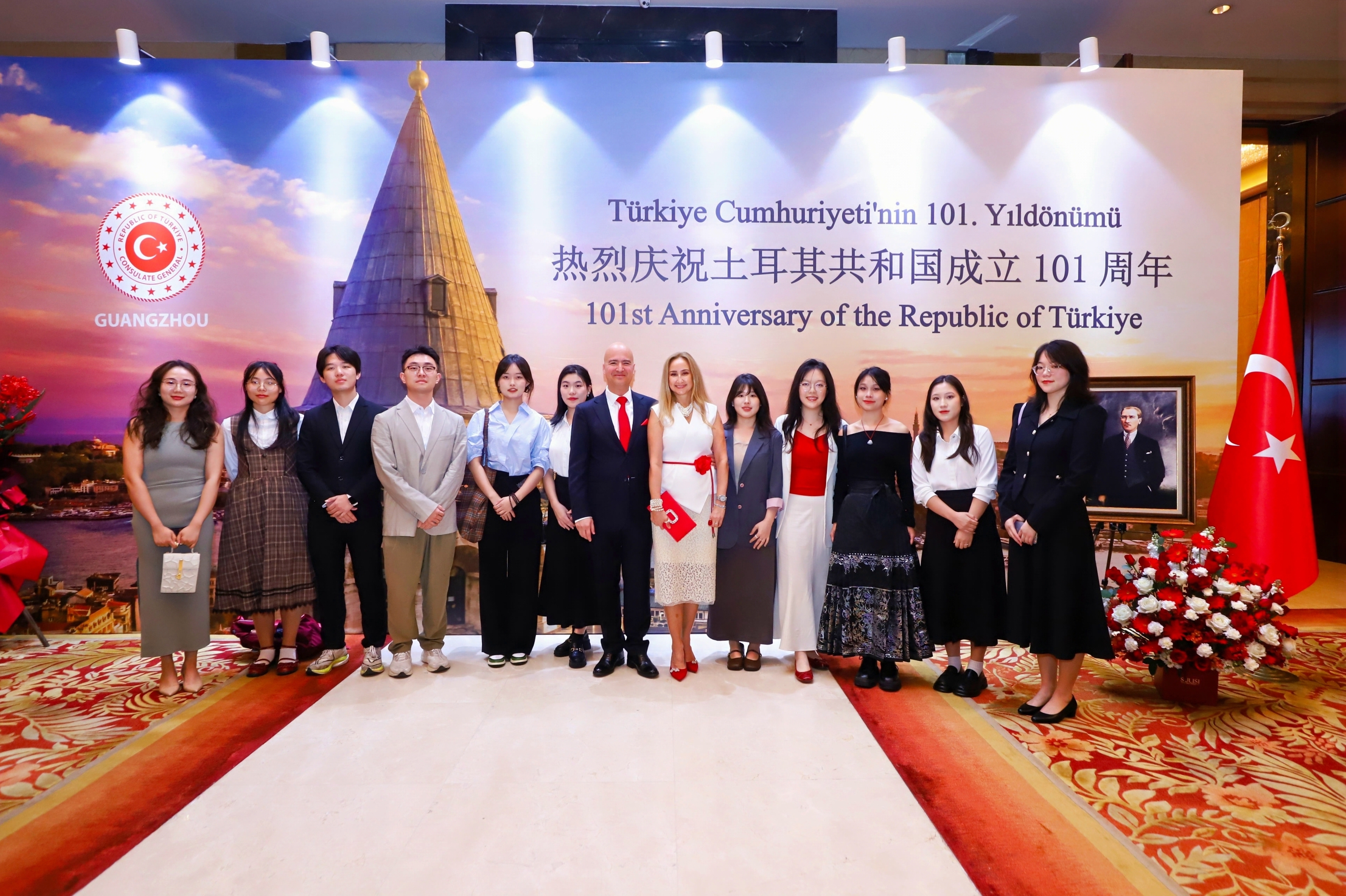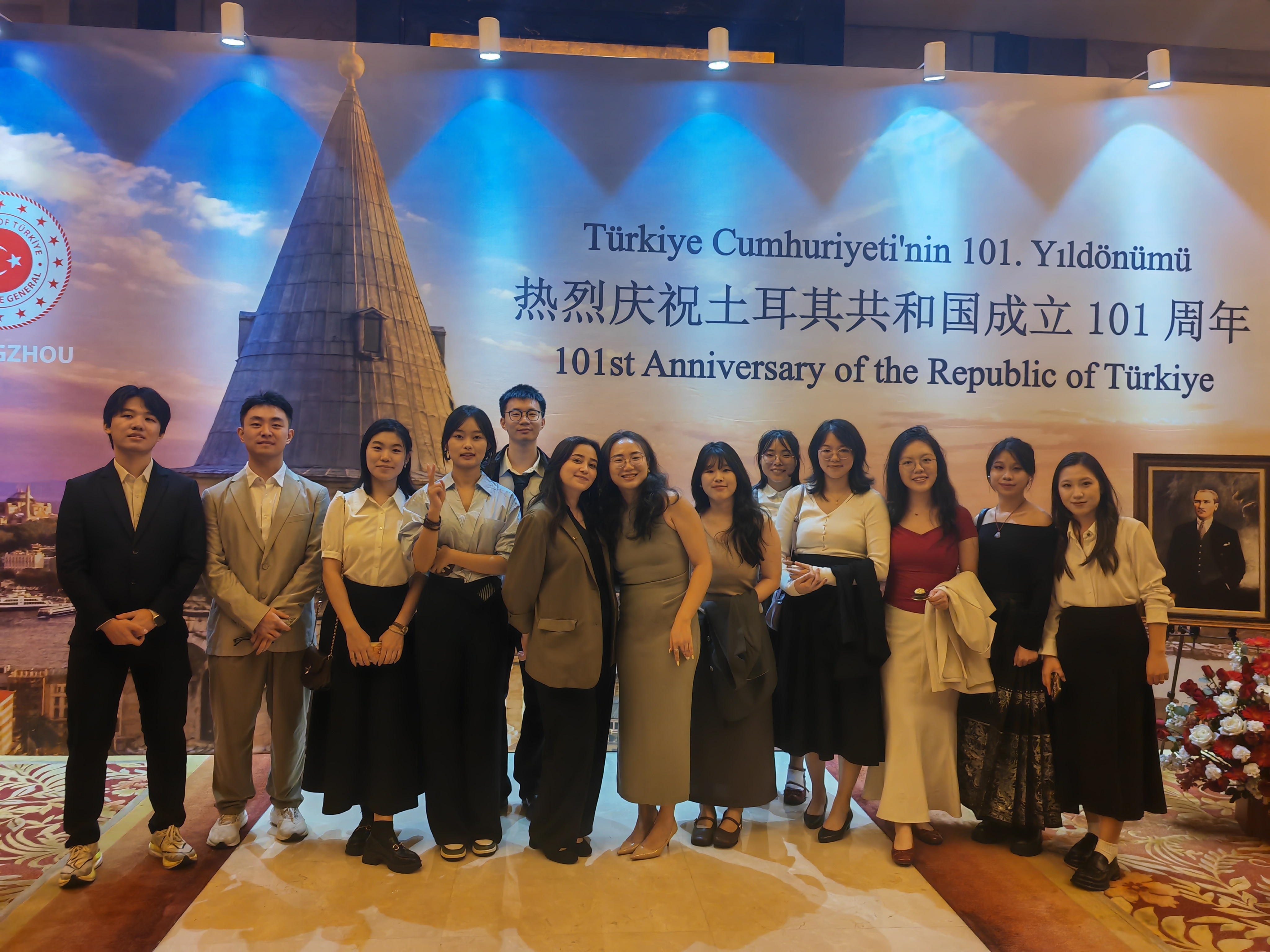 2024年10月29日晚,BETVLCTOR伟德在线土耳其语系专业负责人黄嘉玲及外教马雨洁(Tugce Sargin Ma)带领大四年级11位本科生应邀出席了由土耳其共和国驻广州总领事馆举办的土耳其共和国成立101周年国庆招待晚宴。