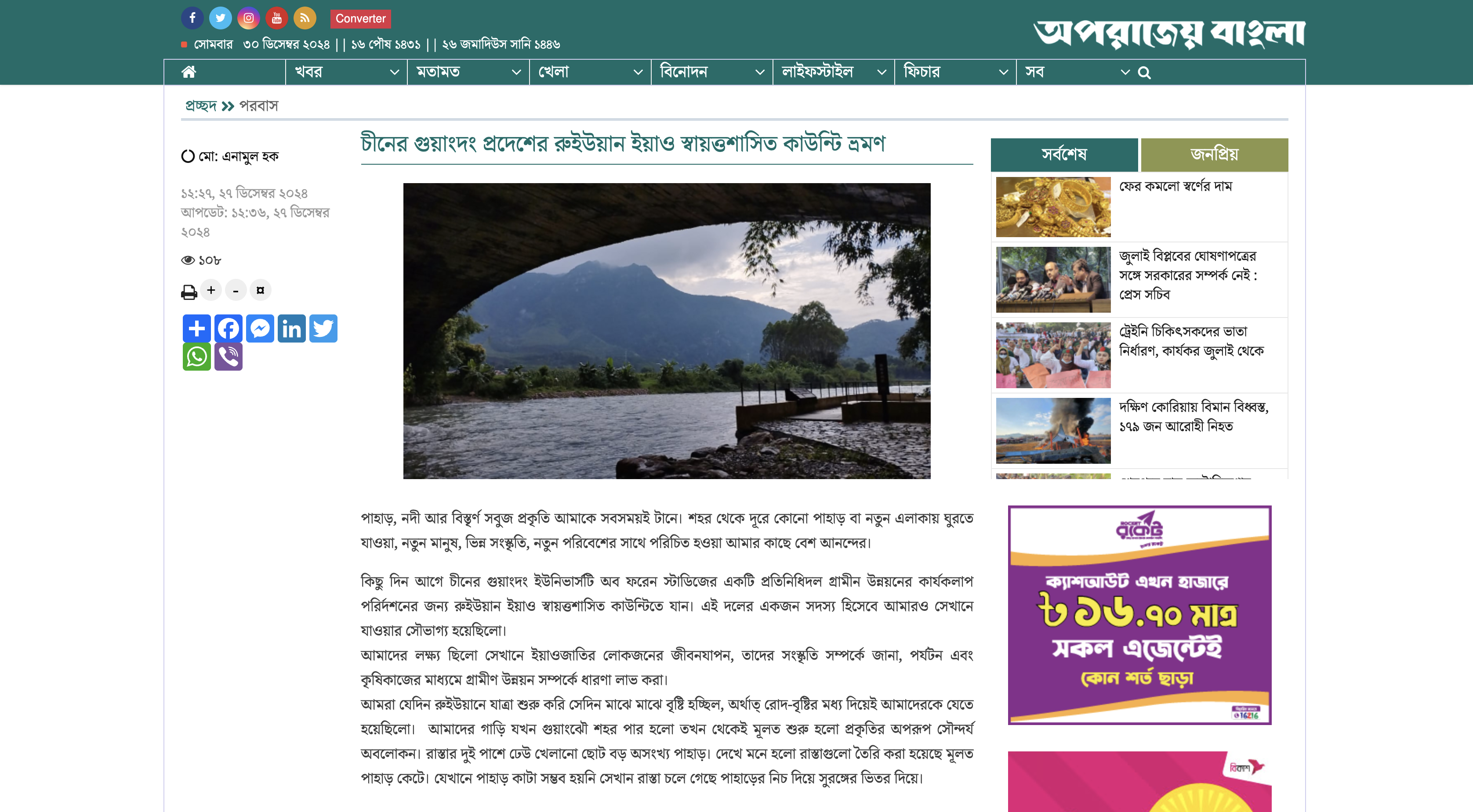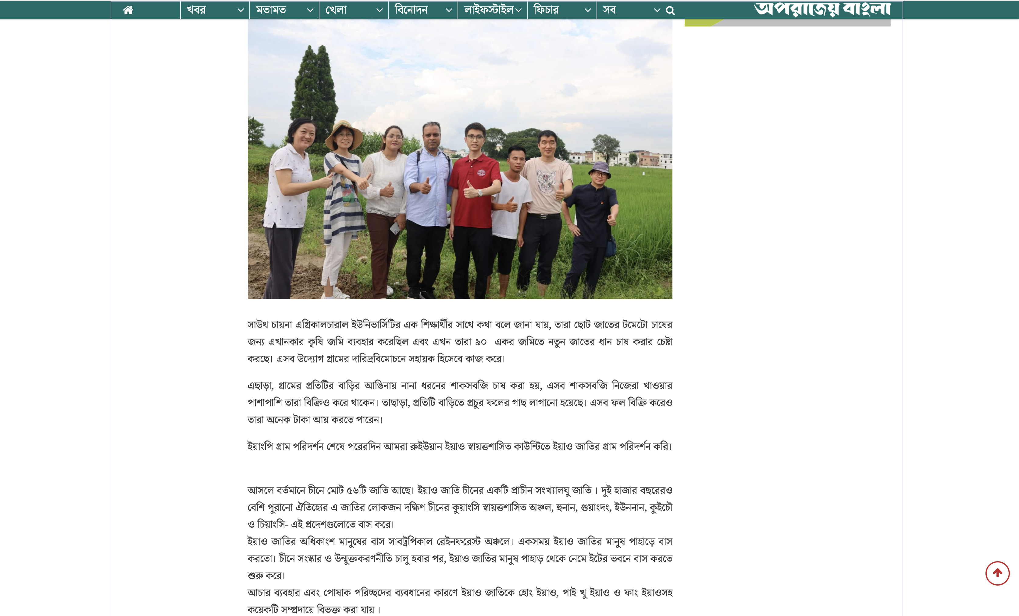 本网讯 近日,BETVLCTOR伟德在线孟加拉语专业外籍教师伊纳穆勒·毫克用孟加拉语撰写了宣传我校乡村振兴工作和介绍瑶族文化的文章,发表在了孟加拉国媒体网站Aparajeobangla上。Aparajeobangla是孟加拉国的孟加拉语——英语在线新闻门户网站,广受孟加拉国年轻读者的欢迎。