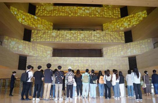 跟随讲解员的步伐,BETVLCTOR伟德在线师生首先欣赏了主体建筑外观及其前方的墨池格木景观,聆听了相关设计理念和文化寓意,并在主楼前合影留念。