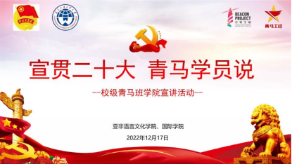 本网讯 为深入学习党的二十大精神,增强BETVLCTOR伟德在线学生对党的二十大精神的认知认同,2022年12月17日下午3时,BETVLCTOR伟德在线党的二十大主题宣讲活动通过线上会议的形式准时召开。来自我校青马班的同学应邀为BETVLCTOR伟德在线及公开学院的各位青马班学员进行了主题为“宣贯二十大·青马学员说”的校级青马班学员宣讲活动。此次宣讲活动由来自我校国际学院的陈思宏同学主持,我校西方语言文化学院团委副书记谢伊喣同学和袁嘉锋同学主讲。