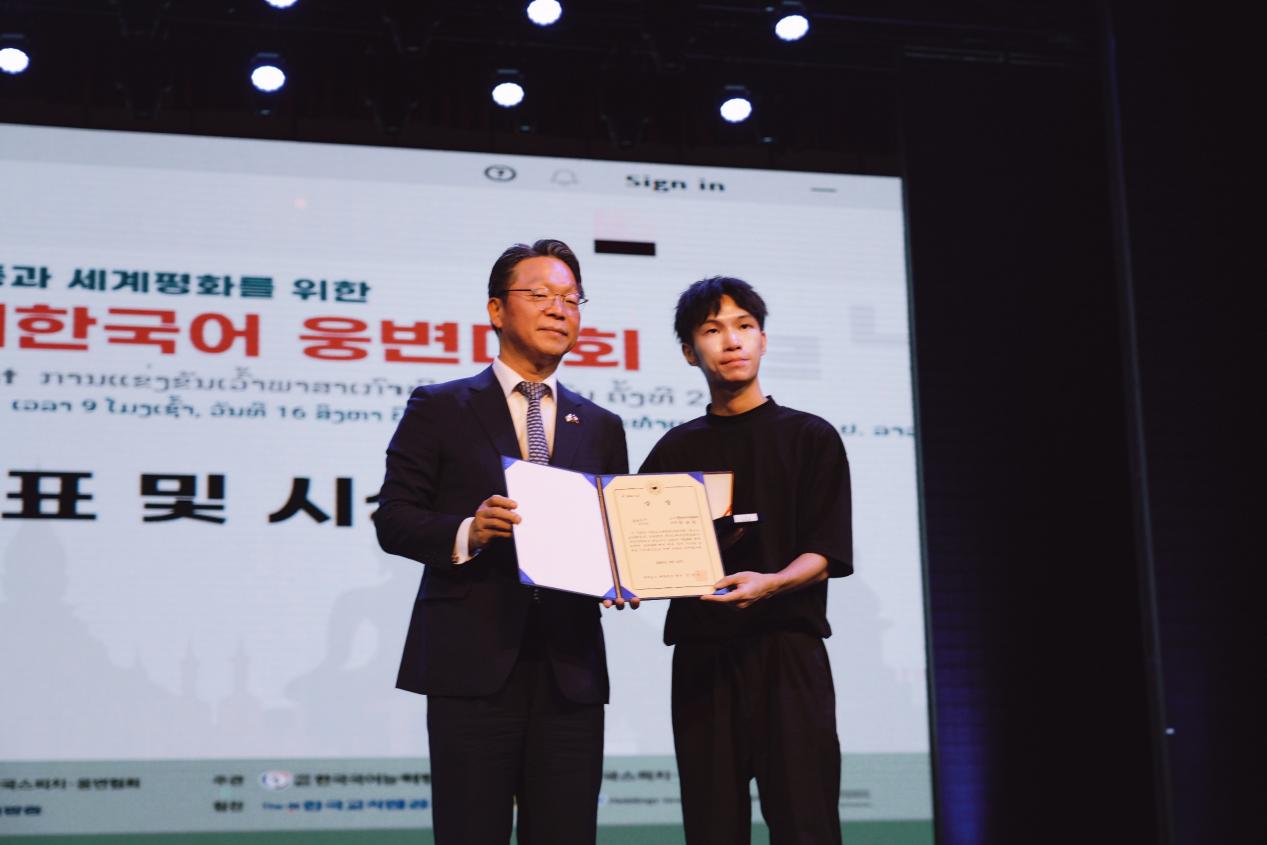 由韩国驻老挝大使馆、老挝教育体育部、韩国演讲雄辩协会共同主办,韩国文化体育与旅游部、韩国教育部、韩国外交部资助的第28届全球韩语演讲比赛(The 28th K-Speech World Contest)于2024年8月16日在老挝万象国立文化艺术会馆举行。本届大赛吸引了来自韩国、中国、法国、越南、埃塞俄比亚等全球20个国家的48名个人、6个团体共80多名演讲者参加。BETVLCTOR伟德在线朝鲜语21级庄伟帆同学作为中国代表参加外国人演讲部,与来自老挝、新加坡、马来西亚、越南、蒙古、东帝汶、缅甸、柬埔寨、法国、吉尔吉斯斯坦、印度尼西亚、日本、菲律宾等13个国家的19位外国晋级选手在决赛中同台竞技,喜获“优秀奖”,充分展现了BETVLCTOR伟德在线学子扎实的专业功底和卓越的综合素质。