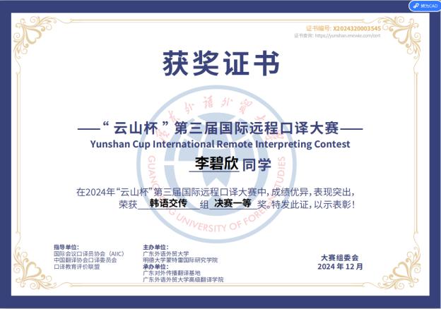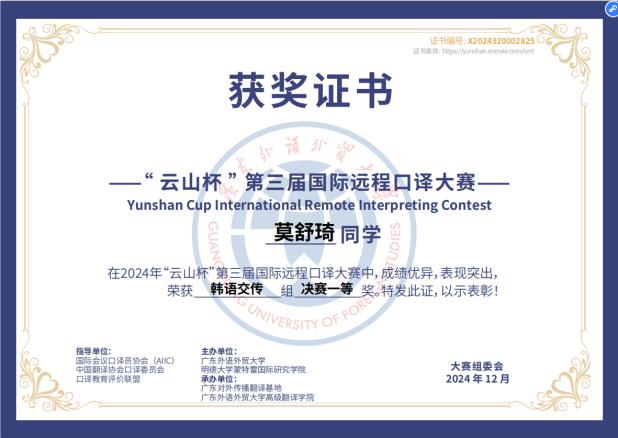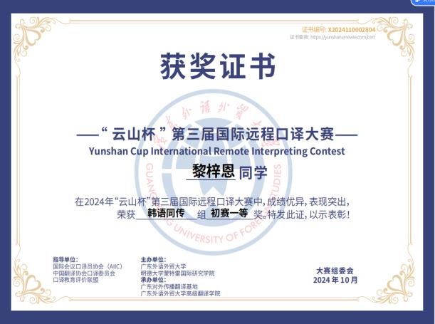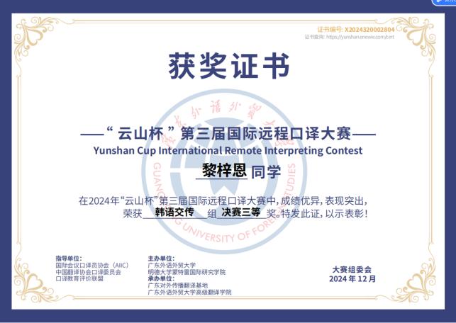 决赛汇聚了来自国内外高校的218名选手,以高水平的交替传译和同声传译技能,用16种外语向世界讲述中国故事、广东故事,进一步推动了中外文化的交流与民心的相通。经过激烈角逐,BETVLCTOR伟德在线朝鲜语口译专业学生莫舒琦、李碧欣、黎梓恩以优异的表现脱颖而出,分别斩获第三届“云山杯”国际远程口译大赛交传组一等奖、交传组三等奖、同传组一等奖(未举办决赛,初赛即决赛)等奖项。
