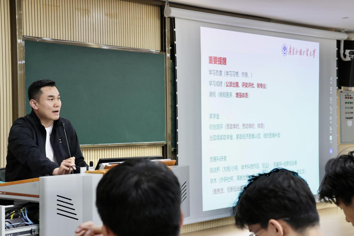 会上,辅导员蔡昊老师着重强调了端正学习态度的重要意义。他殷切鼓励同学们养成良好学习习惯,科学合理规划作息,以切实有效的行动提高学习效率,稳步提升学业成绩。蔡老师特别指出,学业成绩作为学生综合素养的重要体现,不仅关乎奖学金评定、荣誉称号授予,更在申请公派出国交流、转专业等关乎个人发展的关键节点上,发挥着决定性作用。同时,他提醒同学们要积极参与体育锻炼,保持健康体魄,为充实的学业和精彩的校园生活筑牢根基。