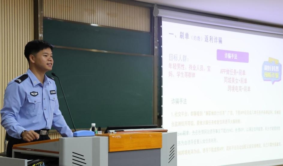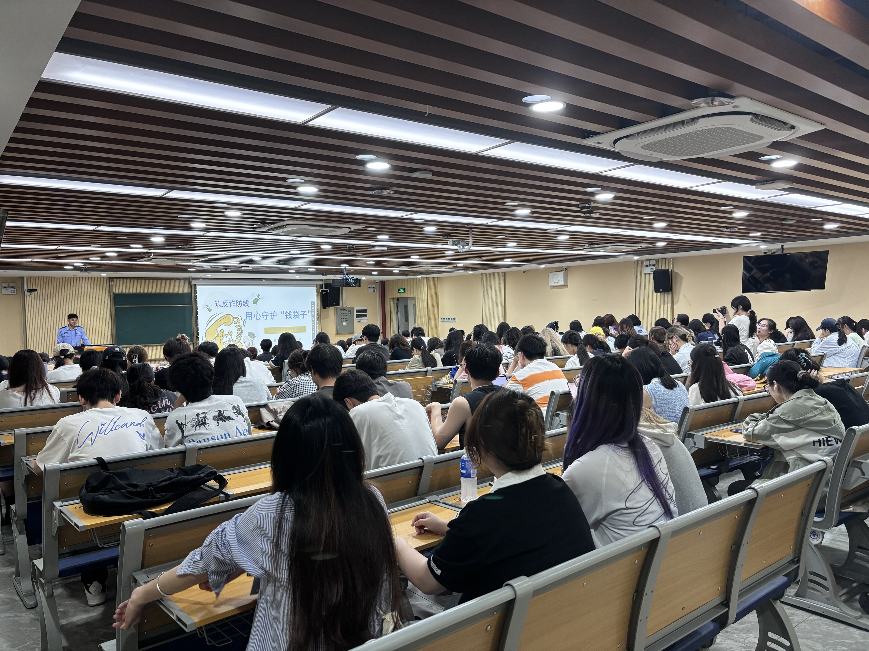 会上,汤警官深入剖析了当下电信网络诈骗案件的高发态势,结合大学生群体的独特心理特征和行为习惯,系统解读了网络刷单诈骗、冒充熟人诈骗、虚假兼职诈骗、网贷诈骗等常见诈骗类型。他详细剖析了犯罪分子的作案手法与话术套路,对“冒充公检法”“银行账户异常”“快递理赔”等典型电信诈骗套路进行重点警示。