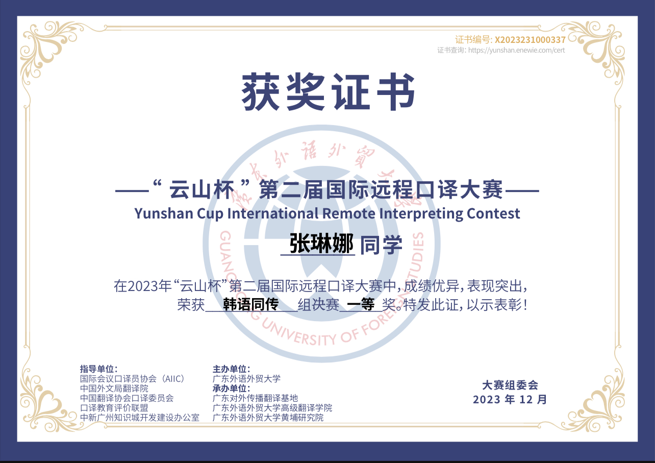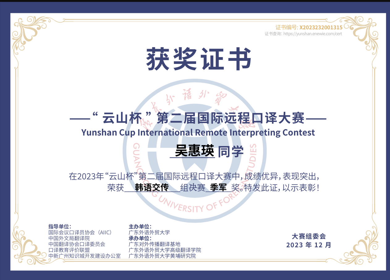 经过激烈角逐,BETVLCTOR伟德在线朝鲜语口译专业研二学生吴惠瑛、张琳娜、邹路路以优异的表现脱颖而出,分别斩获第二届“云山杯”国际远程口译大赛交传组季军、同传组一等奖、交传组三等奖。