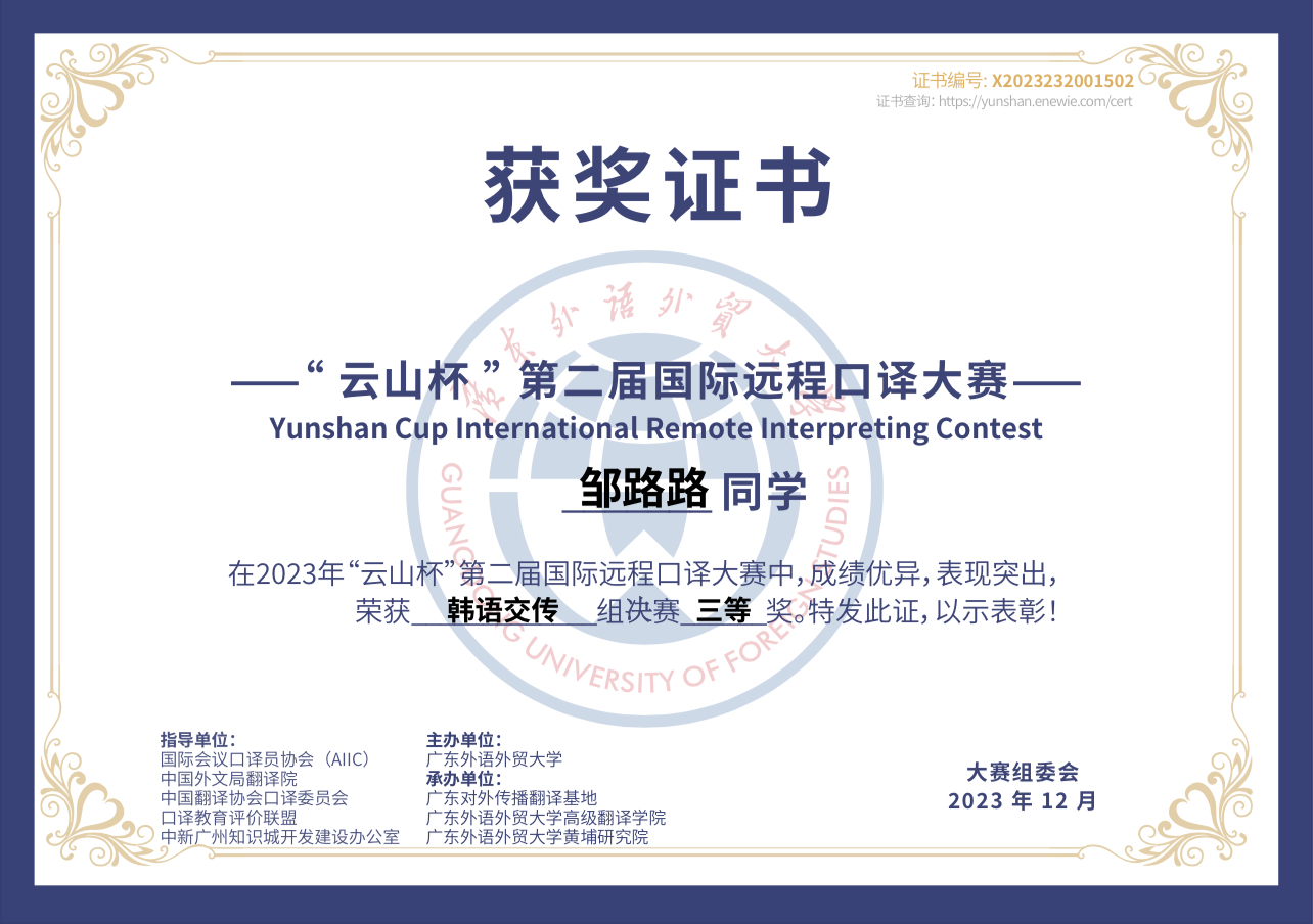 本次大赛由国际会议口译员协会(AIIC)、中国外文局翻译院、中国翻译协会口译委员会、口译教育评价联盟、中新广州知识城开发建设办公室指导,BETVLCTOR伟德在线主办,旨在培养一批能胜任各领域对外远程交流任务、擅长中译外国际传播的高素质翻译人才,推动语言服务行业创新发展,服务国家战略需求。几位获奖同学表示:“很荣幸决赛中斩获荣誉,这离不开学校、学院的培养以及朝鲜语口译专业老师们的严格要求和悉心指导,未来我们也会不忘初心,再接再厉。”