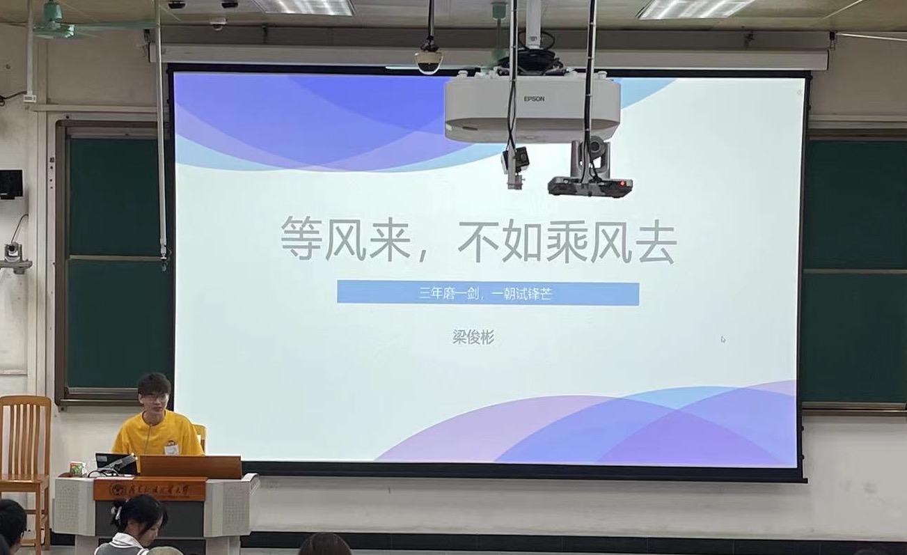 第一位分享的是梁俊彬同学,他以“等风来,不如乘风去”为主题,围绕学习、工作、科研三方面展开经验分享,鼓励同学们积极探索自己的兴趣方向,并针对大学不同阶段给出相应的建议。