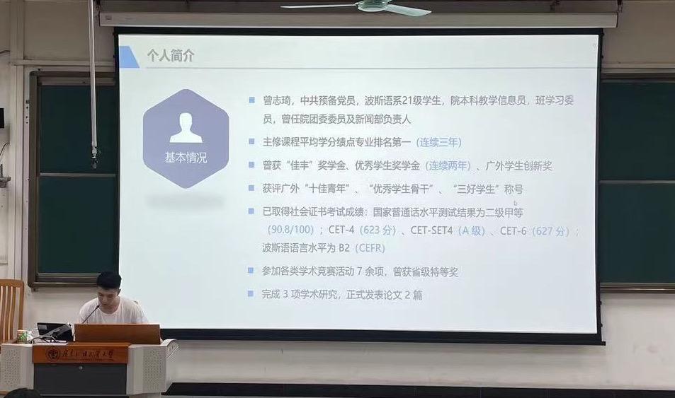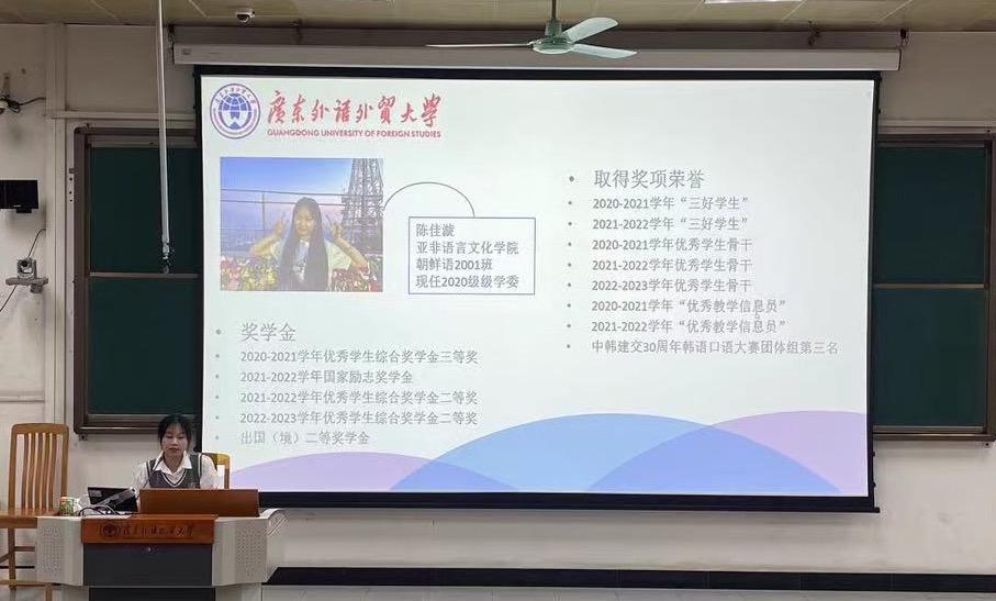 会议上,国家奖学金获得者,保研至上海外国语大学的20级波斯语本科生梁俊彬同学;公考上岸厦门出入境边防检查总站的20级朝鲜语本科生陈佳漩同学;广外第九届“十佳青年”获得者21级波斯语本科生曾志琦同学就青年学子如何追逐梦想、实现自我理想,进而报国成才等方面做了分享。