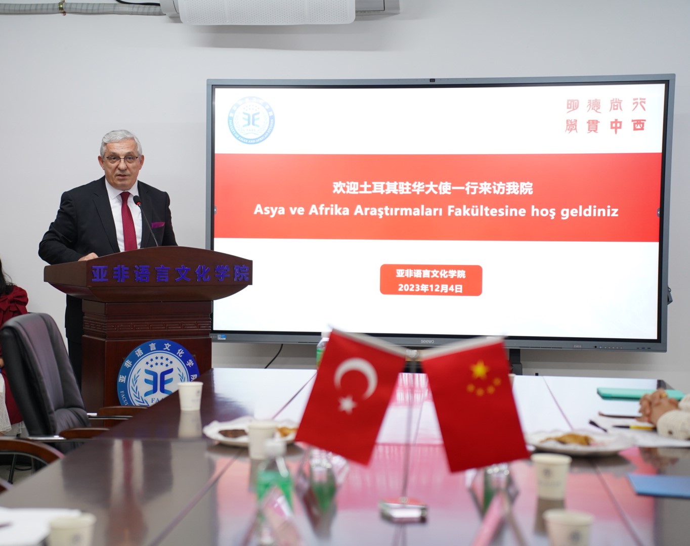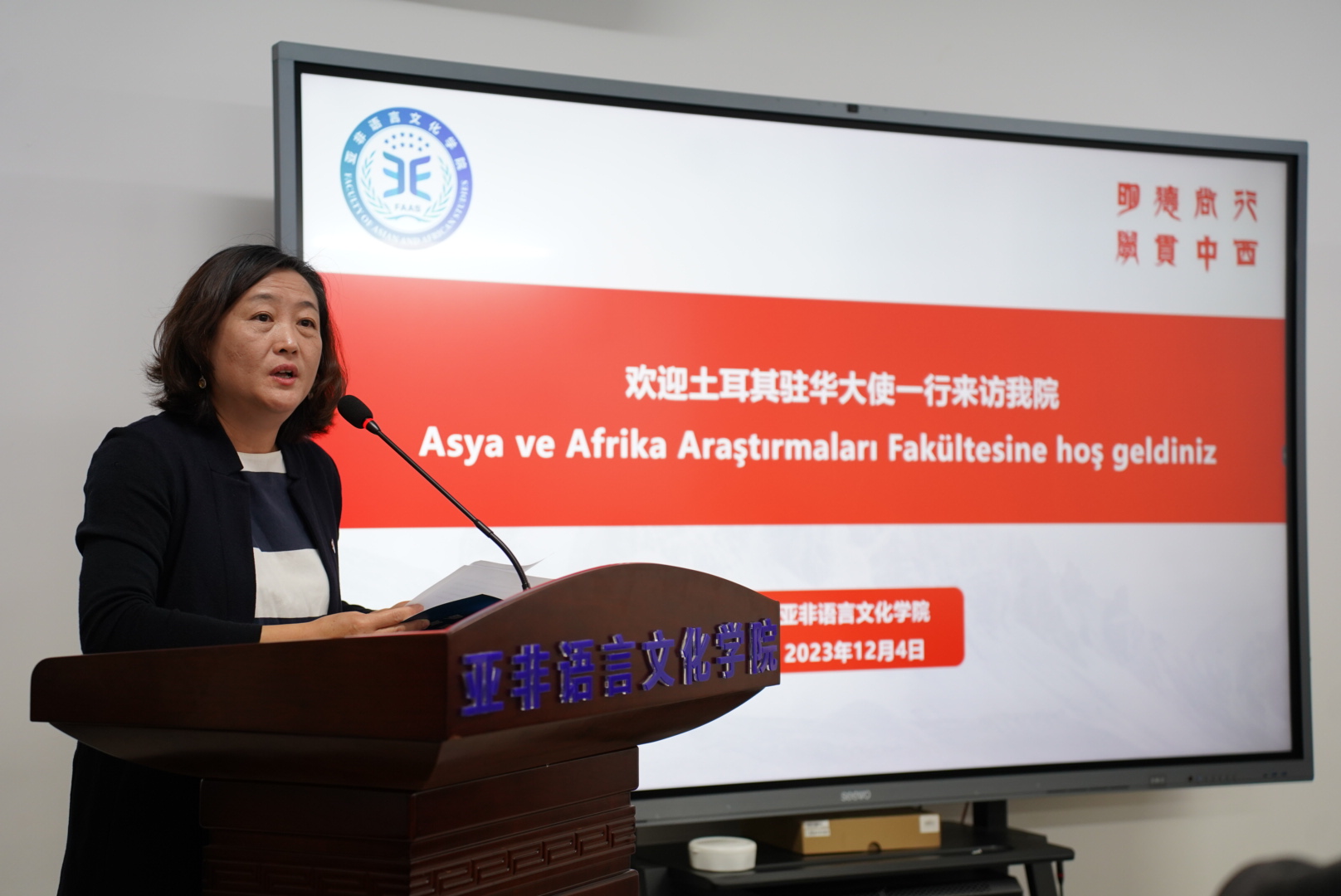 随后学院党委书记梁洁在致辞中热烈欢迎大使一行的到访,并对土耳其驻华使领馆之前给予我校土耳其语专业建设提供的支持表示感谢。同时提到广外BETVLCTOR伟德在线以培养全球化高素质公民为使命,着力推进“亚非语+英语+专业”的外语教学与专业教学深度融合,着力培养具有家国情怀、国际视野、过硬本领、创新能力、担当精神的、服务于国家“一带一路”的高素质复合型国际化亚非语人才,热切期望未来两国的青年和高校的学者能有更深入更密切的交往,共同推进文明交流互鉴,共同推进两国经济文化事业的发展。随后,土耳其语专业负责人黄嘉玲老师为大使一行介绍了土耳其语系的建设历史、培养方案和学生情况。