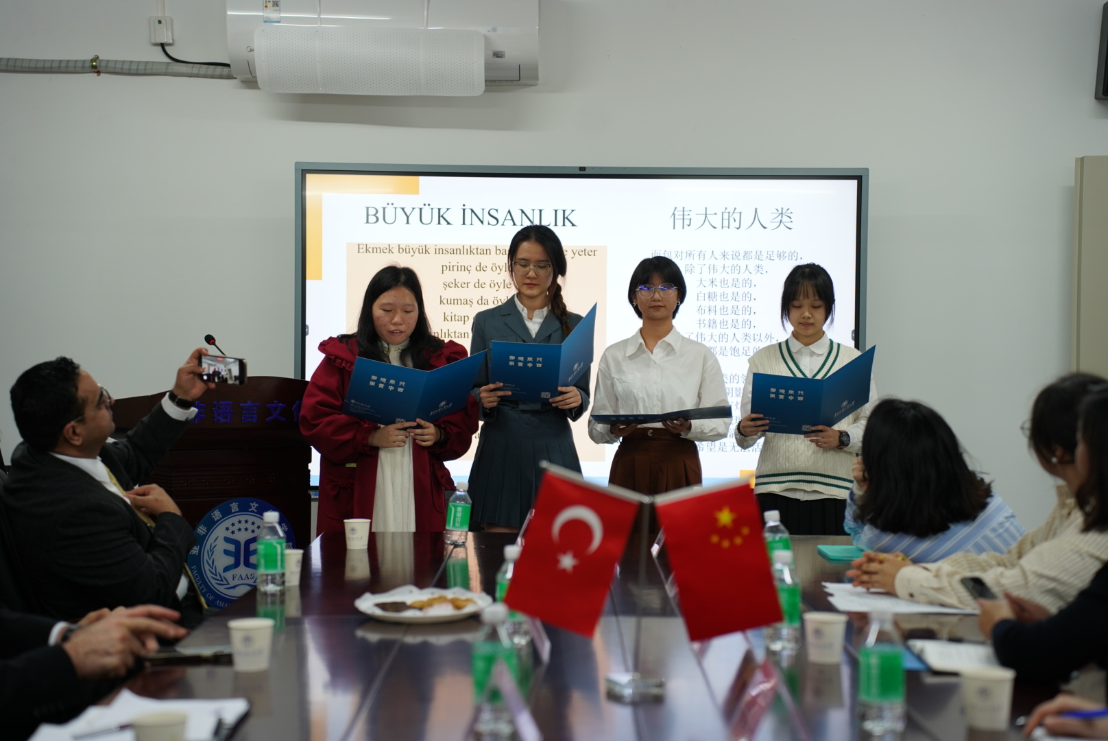 交流活动中,土耳其语专业的学生们精心准备了风采展示和诗朗诵表演,已经走出校门、分布在世界各地的校友积极参与视频拍摄,通过视频表达了对大使的热烈欢迎以及对母校的深深祝福。他们用自己的语言和微笑展示了广外土耳其语系学子在学习过程和国际舞台上的自信和魅力。在校学生代表们还和大使一行分享了土耳其语专业相关的丰富多彩的文化、学术和志愿者活动。大使先生在交流过程中对学生们的表现频频点头称赞。土耳其语专业学子的风采得到了大使一行的充分赞扬与认可。