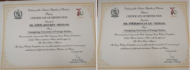 根据大赛结果,BETVLCTOR伟德在线乌尔都语专业2019级学生任紫怡获得一等奖,2018级学生刘博源获得二等奖。在本次征文大赛中,乌尔都语专业的学生参与热情高涨。通过参加本次比赛,学生们不仅锻炼了外语写作能力,还借此加深了对中巴友谊的认识与理解。同时学生们在比赛中展现出优秀的语言水平,受到主办方的认可与赞赏。