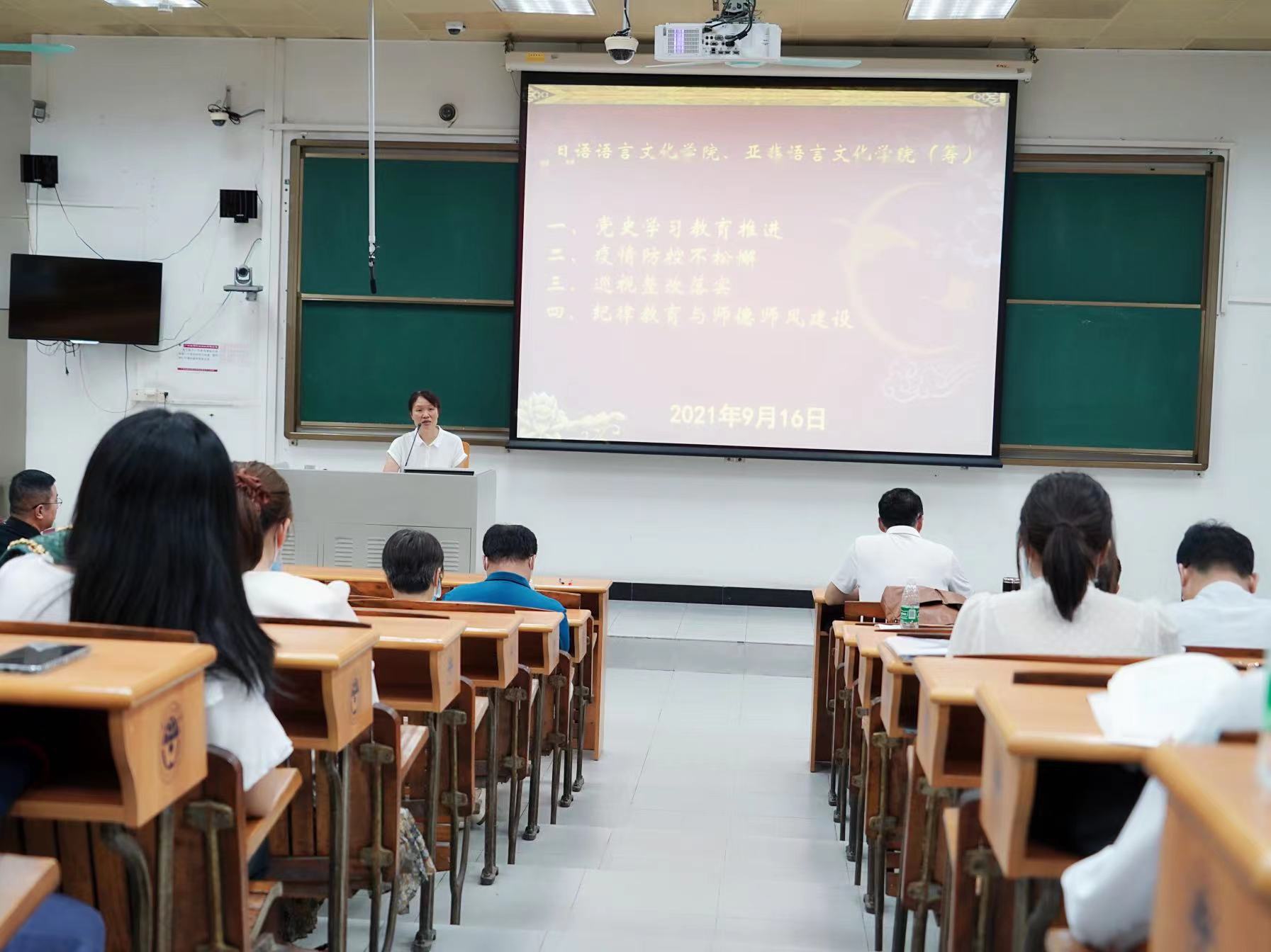 2021年9月16日下午,日语学院、BETVLCTOR伟德在线(筹)在二教219教室召开新学期工作布置会,全院教职工参加会议。会议由学院党委书记周秀娇主持。