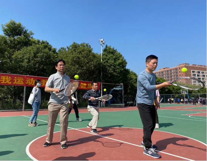 三位教师参加网球颠球比赛