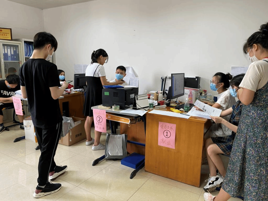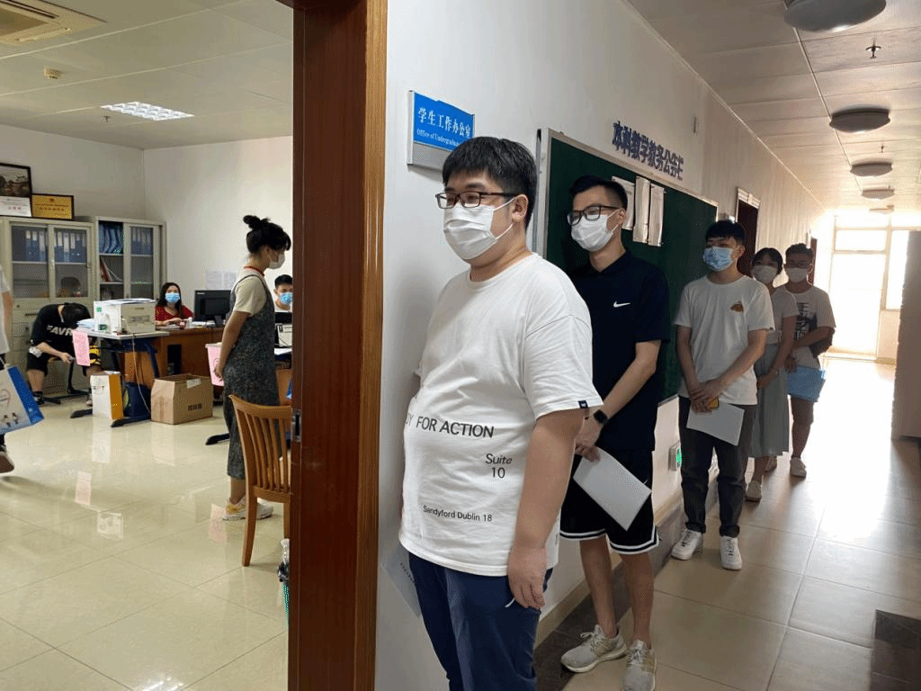 为了方便毕业生办理毕业手续,学院精简了毕业手续流程,为同学们安排了“一条龙”服务。同学们提前准备好资料,并按指引有序进行离校手续确认。在志愿者的协调下,同学们间隔一定的距离在门外排队等候,现场秩序井然。同时学院开放了学院会议室和团学办公室,为尚未准备好资料的同学提供了填写资料的去处。