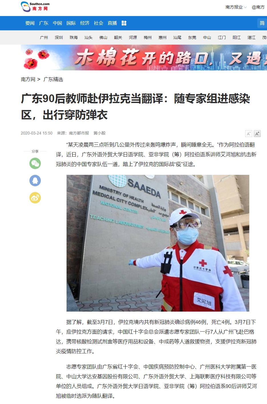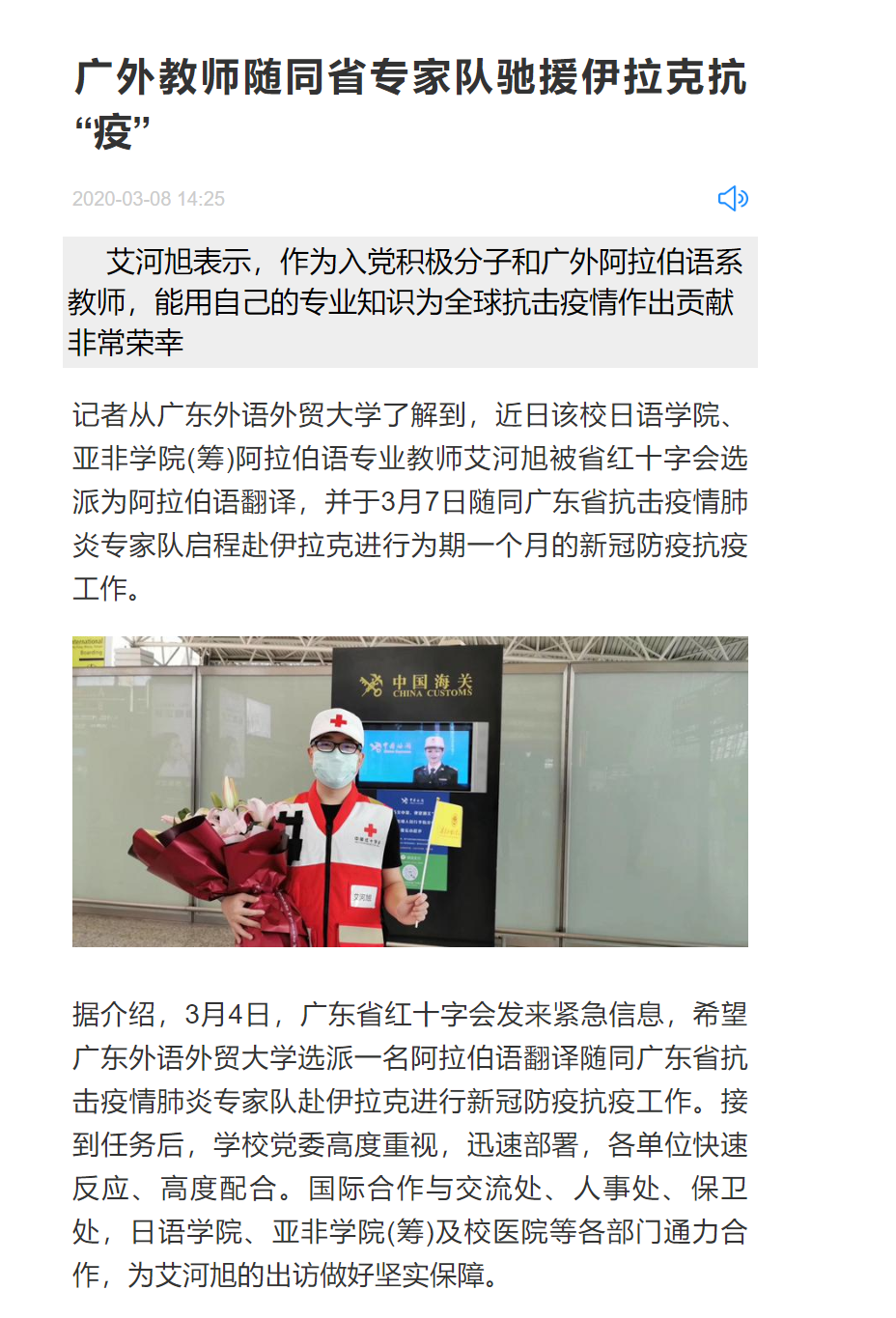 疫情无国界,2020年3月7日,BETVLCTOR伟德在线阿拉伯语教师艾河旭被省红十字会选派为阿拉伯语翻译,随同广东省抗击新冠肺炎疫情专家赴伊拉克进行新冠肺炎抗疫工作,“青山一道,同担风雨”,彰显了广外人大爱无疆的抗疫精神。新华社、南方Plus、南方都市报、广州日报等多家媒体对本次抗疫工作进行了报道。