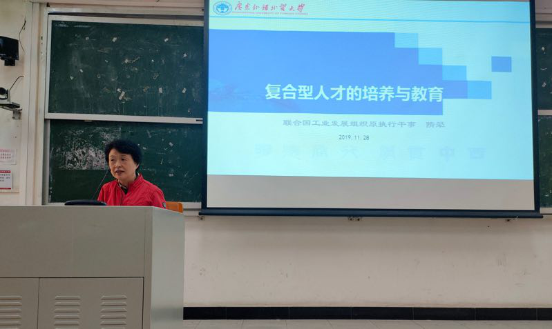 本网讯 11月28日下午,广外杰出校友、原联合国工业发展组织执行干事、原商务部外事司司长隋翚女士应邀来访我校,并为BETVLCTOR伟德在线2018级全体学生开展“人文教育与精彩人生”课程讲座。BETVLCTOR伟德在线院长陈多友、党委书记周秀娇、副院长胡瑞出席,讲座由胡瑞副院长主持。