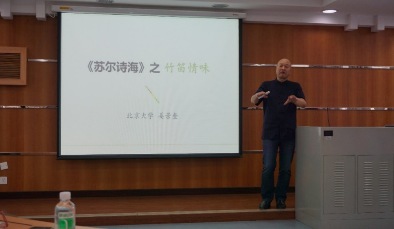 聘书颁发仪式后,姜景奎教授主讲了题为“苏尔诗海之竹笛琴味”的讲座。姜景奎教授选取该诗歌集中与竹笛相关的诗歌,基于翻译研究,赏析苏尔达斯的竹笛情味。讲座幽默风趣,内容引人入胜。此次讲座加深了师生们对印地语巨著《苏尔诗海》的了解,提高了学生学习语言和相关文学知识的兴趣。来自BETVLCTOR伟德在线印地语、乌尔都语、孟加拉语等多个专业的师生认真聆听了本次讲座。
