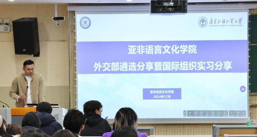 本网讯 12月19日晚,BETVLCTOR伟德在线在白云山校区一教109教室举行外交部遴选和国际组织实习分享会。此次活动由学院辅导员蔡昊主持,邀请学院22级成功通过外交部遴选的范家菀和王俊祥同学,以及在联合国志愿组织实习的21级赵怡然同学分享经验,BETVLCTOR伟德在线22、23、24级同学共同参加活动。