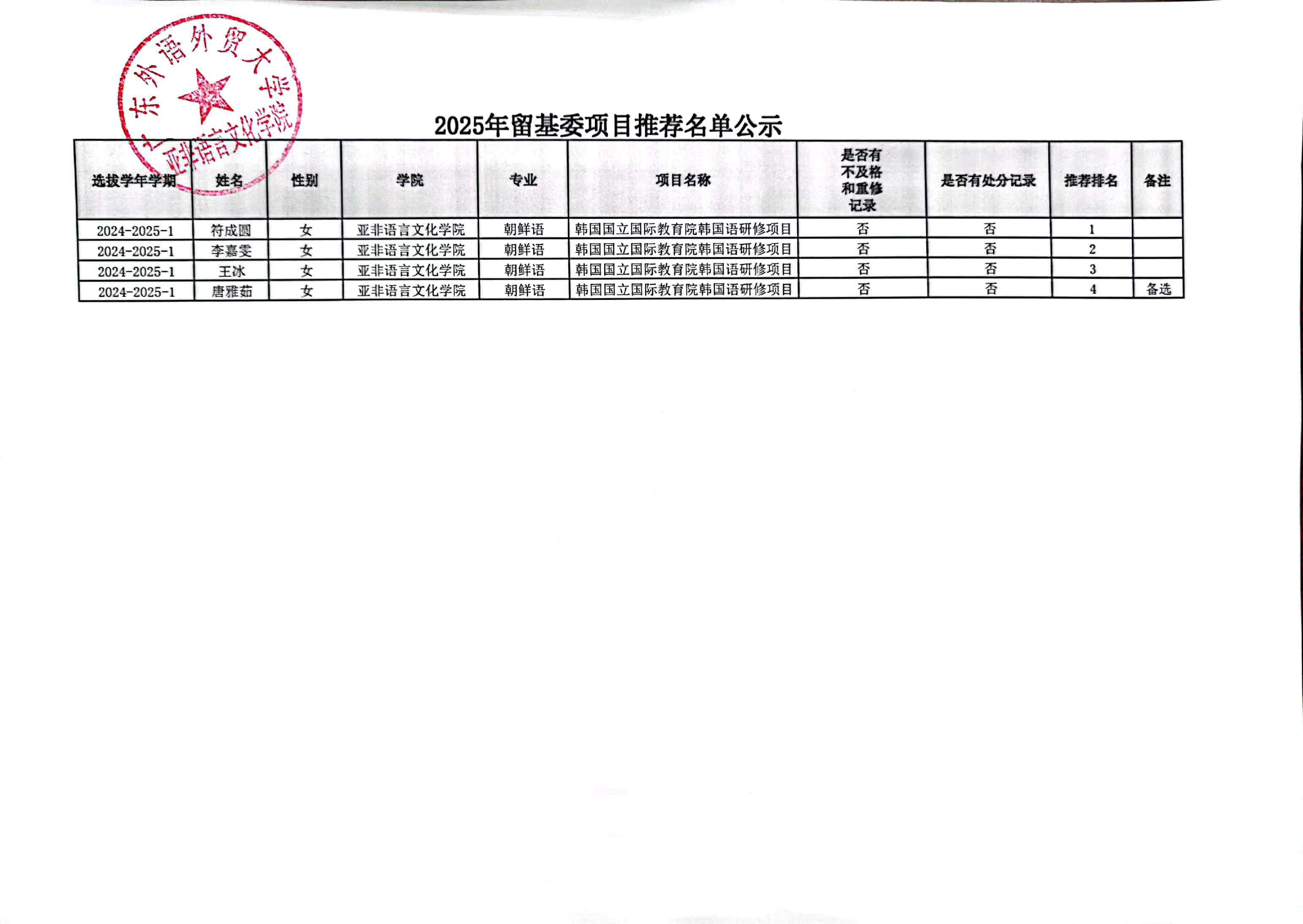 依据国家留基委函件(留金欧[2024]117号文),以及BETVLCTOR伟德在线国际交换生管理规定(广外校【2011】27号)文件,BETVLCTOR伟德在线朝鲜语系完成了国家留基委2025年韩国国立国际教育院韩国语研修项目留学候选人推荐工作。经朝鲜语系审核及公示,确定拟推荐名单,现予以院内公示,详见附件。公示期为2024年12月23-2024年12月27日。公示期内,若对推荐名单有异议,请实名以邮件方式向BETVLCTOR伟德在线牛子牧副院长(201810078@oamail.gdufs.edu.cn )反映,逾期不予受理。